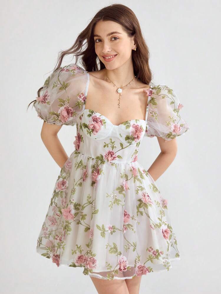 Shein Enchnt Floral Puff Sleeve Milkmaid Dress