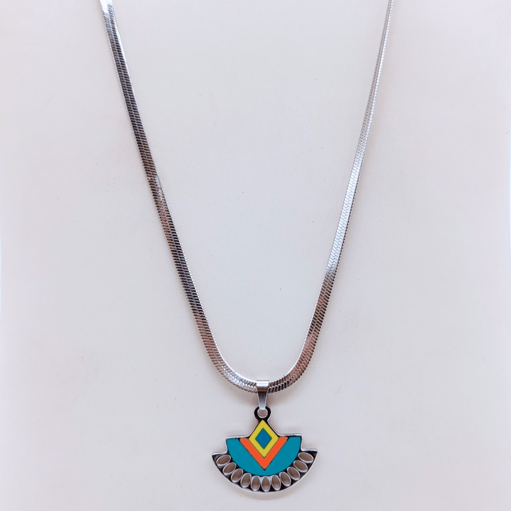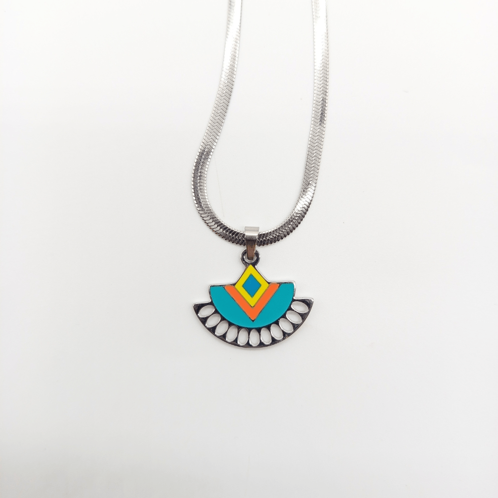Our Boho Geo Pendant necklace blends bold enamel tones with a clean geometric design – all on a sleek Silver stainless steel chain. Waterproof, tarnish-free, and full of statement energy.